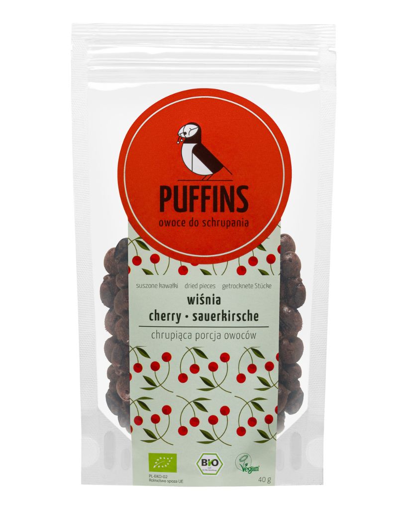 Chrupiąca Wiśnia Puffins to lekki sposób na przełamanie słodkiego smaku porannego musli. Sprawdzi się też jako przekąska po bieganiu, basenie czy siłowni, a także jako mały biurowy deser. Ale nie tylko. Suszona wiśnia Puffins świetnie działa w grupie, jako dodatek do Muesli, owsianki czy jogurtu. Jej lekko cierpko-kwaskowaty smak sprawi, że poczujesz znów moc i dobrą energię.