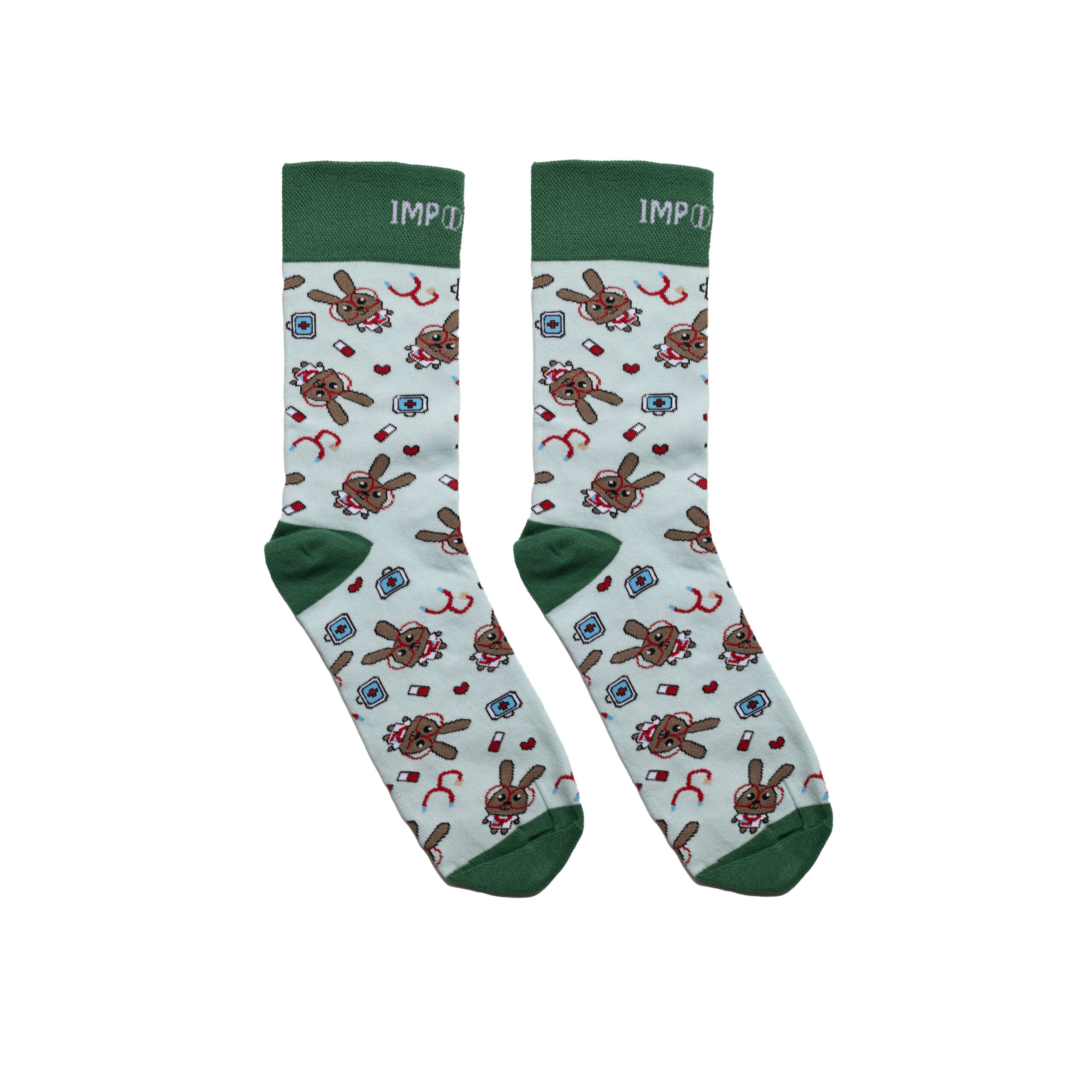 Nasze miętowe skarpetki z wzorem króliczków w lekarskich kitlach, stetoskopami, torbami lekarskimi i pigułkami to idealny sposób, by dodać trochę humoru w trakcie szpitalnego dyżuru. Takich skarpetek na pewno nie miałeś!