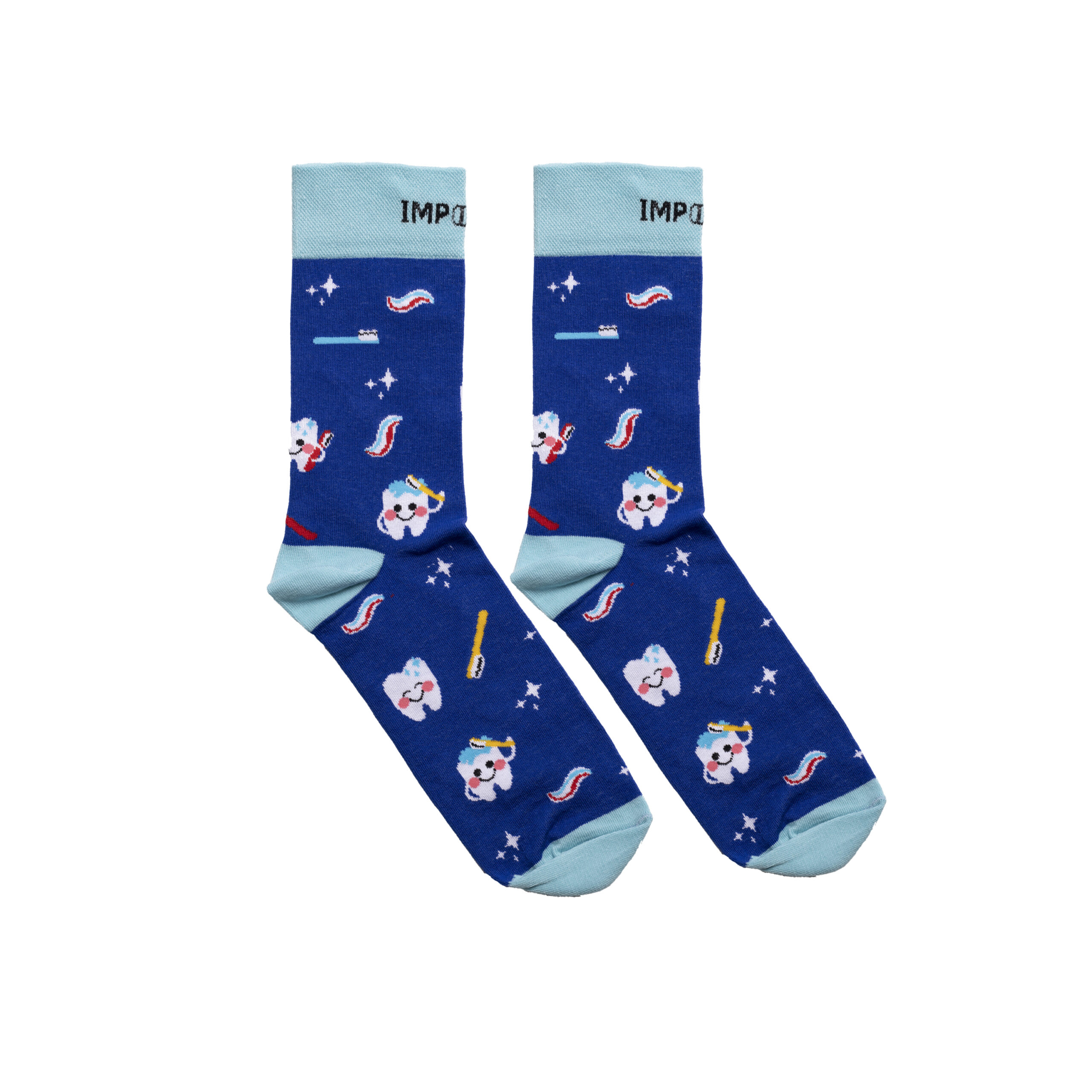 Stomatolodzy i ortodonci! Oto skarpetki, które zrewolucjonizują Waszą garderobę i uśmiech – granatowe cuda z zębami, pastą do zębów i szczoteczkami, gotowe, by dodać blasku i uśmiechu każdemu dniu pracy.