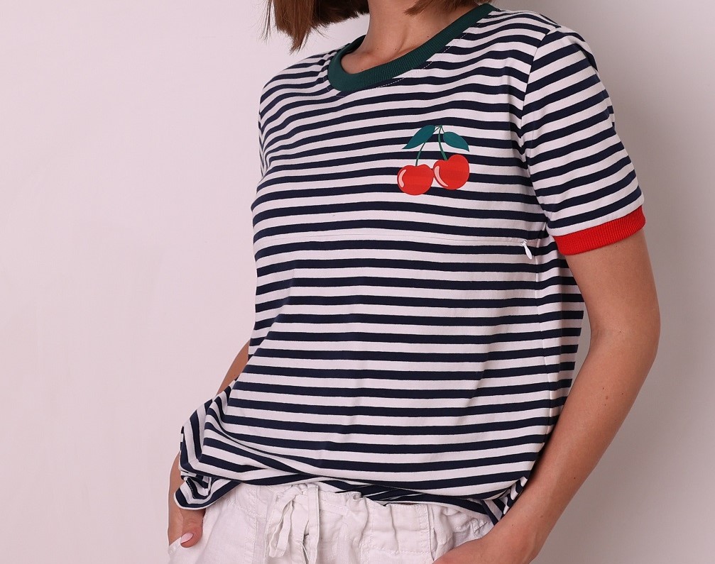 Koszulka do karmienia „Sweet Cherries” to idealna propozycja na lato. Marynarskie paski i słodkie wisienki sprawią, że będziesz pięknie i modnie wyglądać również w tym wyjątkowym okresie, jakim jest karmienie maluszka.
