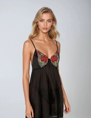 Zwiewna delikatna koszulka z elastycznego miłego w dotyku tiulu. Na biuście ozdobiona delikatnym haftem w śliczne czerwono-złote kwiatki, z przodu pośrodku zwisającą długa atłasową kokarda. Po bokach pęknięcia na szwach, zakończone atłasowa kokardką.